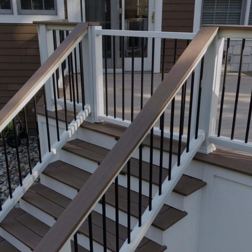 The new design features Trex composite decking, chosen for its durability, low maintenance, and natural wood tones that perfectly complement the home’s exterior. Every detail was considered—from the warm color palette that ties seamlessly into the house, to the new landscaping that softens the edges and blends the deck beautifully into the yard.